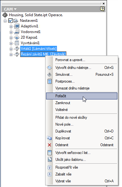 Chcete-li operaci zapnout, vyberte ji v Prohlížeči CAM, klikněte pravým tlačítkem a poté v místní nabídce opět vyberte příkaz Vypnout. Poté pomocí příkazu Vytvořit obnovte trajektorii nástroje.
