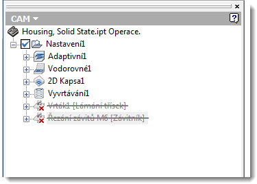 Platná trajektorie nástroje bude při vypnutí operace vymazána a zobrazí se zpráva upozornění. Vypnuté operace se nyní zobrazují v Prohlížeči CAM jako neaktivní (šedou barvou) a vedle nich je malé červené písmeno „x“, které znamená, že trajektorie nástroje nejsou platné.