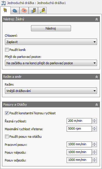 Toto nastavení v závislosti na strategii soustružení (profil nebo drážkové) určuje, zda je obrábění nástrojem prováděno axiálně nebo radiálně a jaký je směr přiblížení a návratu.