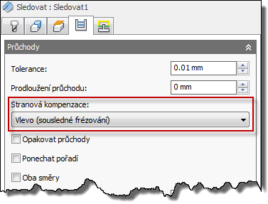 Možnost Sledovat umožňuje kompenzovat nástroj na levé a pravé straně vybraných kontur.