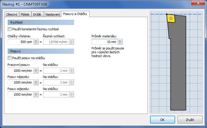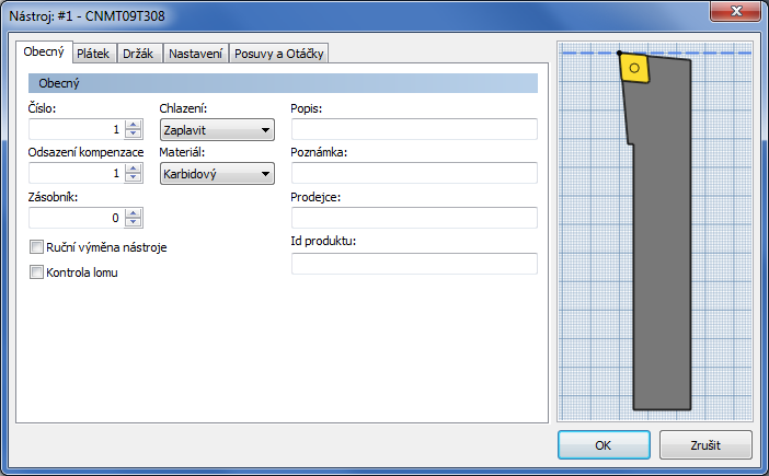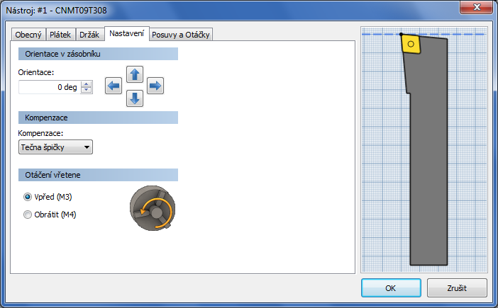 Dialog Nový soustružnický nástroj umožňuje úpravu jednotlivých nástrojů k soustružení. Je rozdělen do pěti karet: