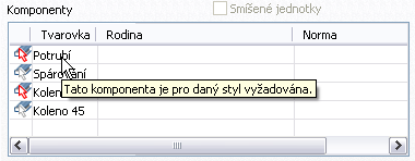 Tabulka komponent obsahuje přehled základní sady komponent zobrazeného nebo vytvářeného stylu. Symboly označují, zda se jedná o volitelnou nebo nutnou komponentu a zda jsou s komponentou spojeny problémy. Při zastavení kurzoru nad symbolem, zobrazí se popisek.