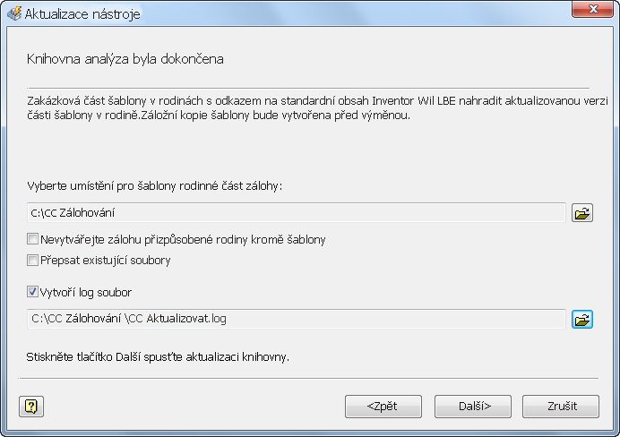 Bude provedena analýza knihovny a její výsledky se zobrazí. Pokud budou nalezeny jakékoliv problémy, je třeba je před pokračováním vyřešit. Pokud nejsou nalezeny žádné problémy, zobrazí se možnosti zálohování. Určete složku, ve které se má vytvořit záloha, a klikněte na tlačítko Další.