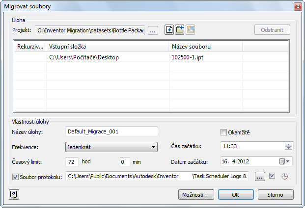 Plánovač úloh vytváří soubor protokolu, který zaznamenává, u kterých souborů proběhla migrace úspěšně a u kterých byla neúspěšná. Soubor je ve formátu ASCII (TXT) a ve výchozím nastavení je umístěn ve složce c:\My Documents\Inventor <verze> \Task Scheduler\Log & Report Files nebo C:\Users\Public\Documents\Autodesk\Inventor <verze>\Task Scheduler Logs & Reports.