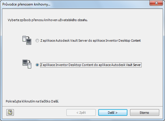 2. Chcete-li přejít do dialogu Průvodce převedením knihovny, klikněte na tlačítko Průvodce převedením knihovny... Viz obrázek 2. Vyberte možnost Z aplikace Inventor Desktop Content do serveru Autodesk Vault Server.