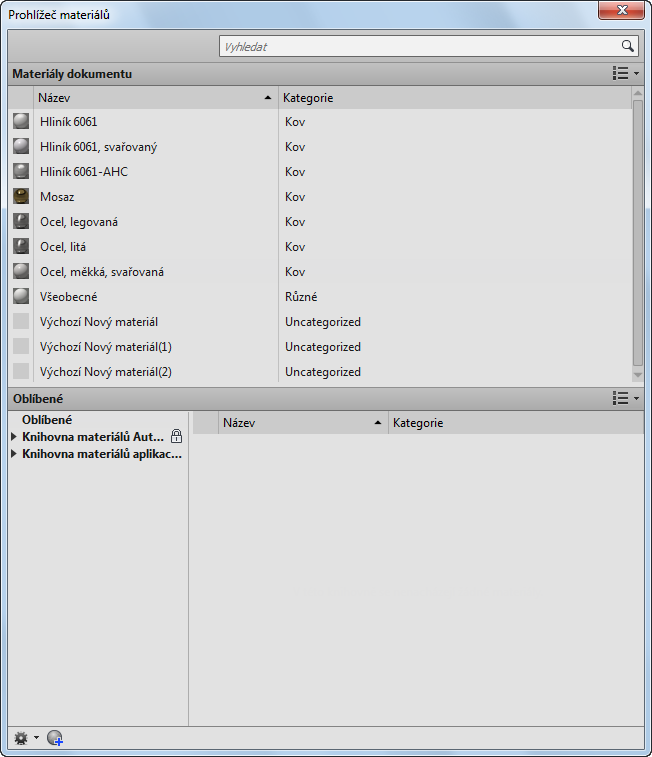 • Na kartě nástroje na panelu Materiál a vzhled vyhledejte příkaz Materiál. Alternativně lze příkaz Materiál spustit také z panelu nástrojů Rychlý přístup. Kliknutím na příkaz Materiál otevřete dialog Prohlížeč materiálů – viz obrázek 1.