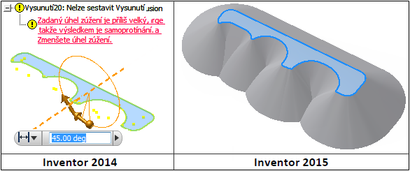 Je vylepšena robustnost skořepinových a kuželových vysunutí. Nyní dokáží pracovat i se složitějšími geometriemi. V aplikaci Inventor 2014 můžete vysunout následující profil s odpovídající tečnou vazbou s maximálním úhlem zúžení pouze 27 stupňů. V aplikaci Inventor 2015 může mít úhel zúžení rozsah od 0 do 90 stupňů.