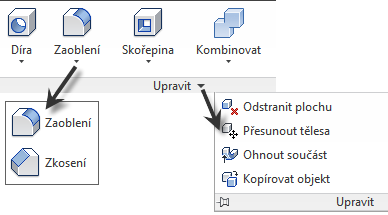 Některé příkazy byly přesunuty z hlavního panelu na dílčí panel nebo do rozevíracího seznamu na panelu. Například v souboru součásti (IPT) na panelu Upravit na kartě 3D model je přehlednější prostředí, které ve výchozím nastavení zobrazuje méně příkazů. Ostatní příkazy panelu Upravit jsou přesunuty do rozevírací nabídky nebo na rozbalený panel Upravit: