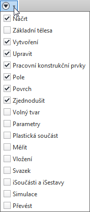 Panely s méně často používanými příkazy nebo příkazy s duplicitními přístupovými body jsou skryty, aby byla zajištěna optimalizace místa v pracovním prostoru. Máte více prostoru k zobrazení modelů a práci s nimi. Například na kartě 3D Model jsou ve výchozím nastavení skryty panely Základní tělesa, Parametry, Odměřit, Plastová součást, Svazek, iSoučásti a iSestavy, Simulace a Převést.