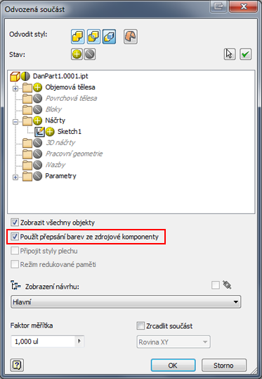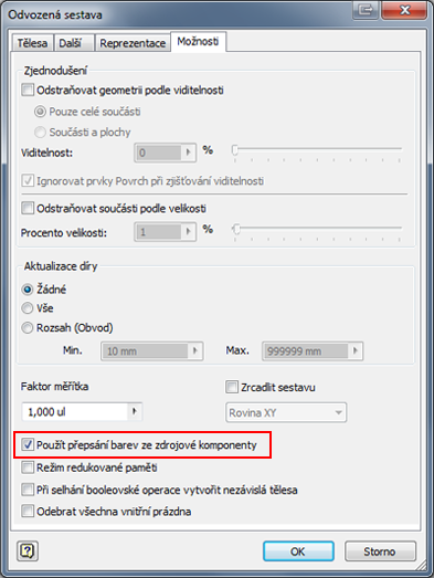 V dialozích Odvozená sestava, Odvozená součást, Vytvořit součást a Vytvořit komponenty je nově k dispozici možnost Použít přepsání barev ze zdrojové komponenty. Pokud je tato možnost zaškrtnuta, přepsání vzhledů součástí a barev těles, prvků nebo ploch jsou zkopírována z ploch odvozené součásti do nové součásti Pokud políčko není zaškrtnuto, je nastaven výchozí vzhled.