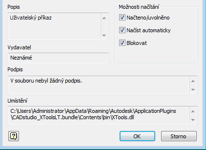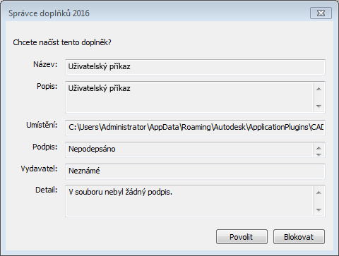 Při načtení doplňku, který nepochází od společnosti Autodesk, se zobrazí nový dialog. Nyní můžete vybrat, zda načtení doplňku povolíte nebo zablokujete. Toto nastavení bude uchováno pro následné relace. Nastavení Povolit/blokovat můžete zkontrolovat a změnit pomocí Správce doplňků.