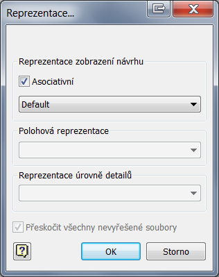 Pomocí nového dialogu Reprezentace můžete změnit aktuální zobrazení návrhu a asociativitu. Chcete-li tento nový dialog otevřít, klikněte v prezentaci v prohlížeči modelu pravým tlačítkem na uzel Rozložení a vyberte možnost Reprezentace.
