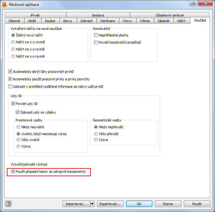 V průběhu relace lze nastavit, aby políčko Použít přepsání barev ze zdrojové komponenty bylo či nebylo stále zaškrtnuto. K tomuto zaškrtávacímu políčku lze mít přístup v dialogu Možnosti aplikace.