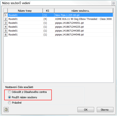 Zobrazit výzvu k zadání názvů souborů tvarovek (vložení obsahu jako vlastního): Výběrem této možnosti můžete upravit názvy tvarovek v dialogu Názvy potrubních souborů.