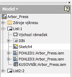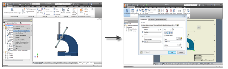 Nový příkaz Vytvořit výkresový pohled slučuje několik kroků do jediného a umožňuje rychlé vytváření výkresových pohledů ze souboru modelu. V souboru modelu podle potřeby uspořádejte model. Potom klikněte pravým tlačítkem na kořenovou komponentu v prohlížeči a klikněte na položku Vytvořit výkresový pohled.