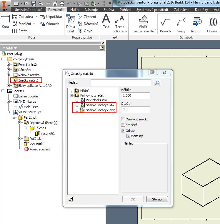 Nyní lze do knihovny značek náčrtu vkládat soubory IDW i DWG. Knihovnu značek náčrtů lze vytvořit ve formátech IDW a DWG, aby bylo možné vkládat značky v souboru knihovny v obou formátech.