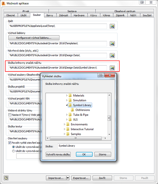 V dialogu Možnosti aplikace na kartě souborů je k dispozici nová položka konfigurace Složka knihovny značek náčrtu. Zde můžete určit složku mimo strukturu dat návrhu, do které se budou ukládat šablony knihovny značek náčrtu. Kliknutím na ikonu Procházet vyhledejte složku nebo kliknutím na ikonu Vytvořit novou složku vytvořte umístění k ukládání knihoven.