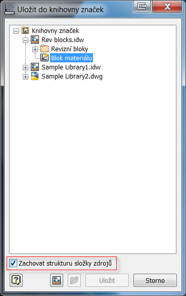Při ukládání značek náčrtů do knihovny můžete zachovat strukturu složky knihovny. Chcete-li to udělat, zaškrtněte políčko Zachovat strukturu složky zdrojů.