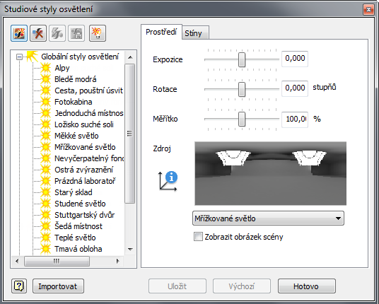 Všechny styly světla v aplikaci Inventor Studio jsou nyní asociovány s osvětlením založeným na obrázku. IBL poskytuje lepší zdroj osvětlení.