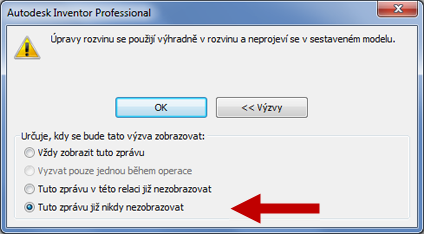 Zprávu upozornění lze zavřít při provádění úprav rozvinu.