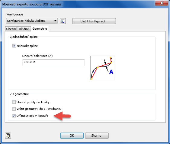 Některé produkty třetích stran neumožňovaly použití exportovaného souboru DWG či DXF rozvinu, pokud osa ohybu procházela dírou v ohybu. Na kartu Geometrie dialogu Možnosti exportu souboru DWG rozvinu a Možnosti exportu souboru DXF rozvinu byla přidána nová možnost. Vyzkoušejte novou možnost Oříznout osy v kontuře na kartě Geometrie, která umožňuje oříznout osy ohybu na hraně řezu.