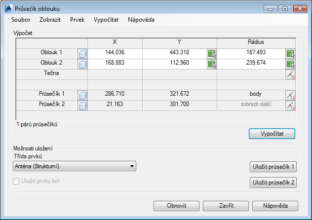 Následující dialog průsečíku oblouku zobrazuje ovládací prvky dialogu a komponent u příkazů Konstrukce a Výpočet.
