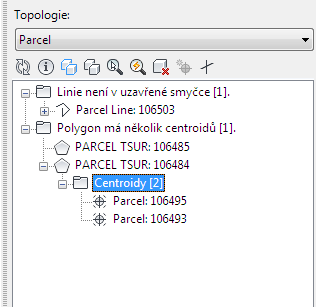 Dialog Kontrola topologie plochy uvádí všechny nalezené chyby topologie v prohlížeči prvků.