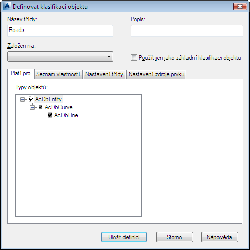 Chcete-li například změnit hladinu, typ čáry nebo barvu pro všechny členy třídy Cesty jako skupiny, vyberte tyto vlastnosti. Podle potřeby je možné nastavit výchozí hodnoty. Například všechny členy třídy Cesty můžete přiřadit k hladině Cesty.