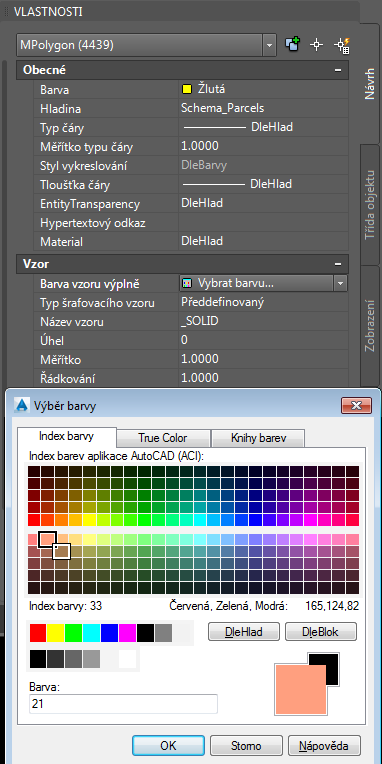 Pomocí palety Vlastnosti změňte barvu výplně všech objektů ve třídě objektů Parcely.