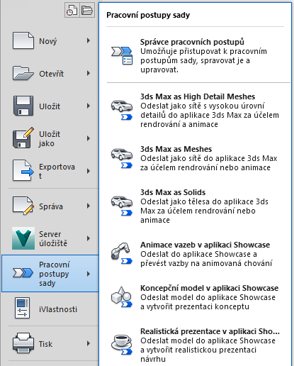 Daný pracovní postup použije předem vybraná nastavení aplikace 3ds Max Design nebo Showcase na data návrhu ze zdrojového produktu (aplikace AutoCAD, Inventor nebo Revit). V každém zdrojovém produktu jsou k dispozici různé pracovní postupy, které mohou být optimalizovány pro specifické účely, například rendrování ve vysoké kvalitě nebo analýzu osvětlení.
