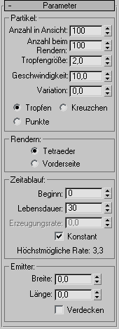 - Sie legen den anfänglichen Wert dieser Parameter automatisch beim Ziehen der Maus in einem Ansichtsfenster fest, wenn Sie den Emitter erstellen. Sie können diese Werte im Rollout festlegen.