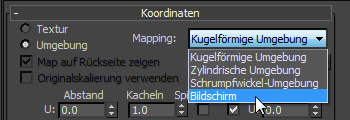 - Öffnen Sie im Rollout Koordinaten die Dropdown-Liste Mapping, und wählen Sie Bildschirm aus.