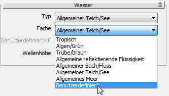- Öffnen Sie im Rollout "Wasser" die Dropdown-Liste "Farbe", und wählen Sie "Benutzerdefiniert".