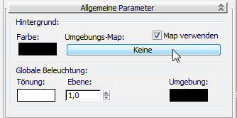 - Wählen Sie im Menü "Rendern" die Option "Umgebung", um das Dialogfeld "Umgebung und Effekte" zu öffnen. Klicken Sie im Rollout "Allgemeine Parameter" auf die Schaltfläche "Umgebungs-Map" (derzeit steht dort “Keine").