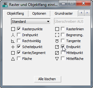 - Aktivieren Sie in der Registerkarte "Objektfang" die Optionen "Rasterpunkte", "Scheitelpunkt", "Kante/Segment" und "Endpunkt". Stellen Sie sicher, dass alle anderen Objektfänge deaktiviert sind.