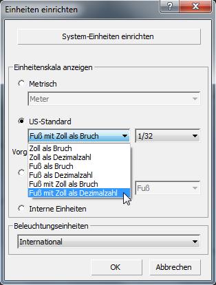 Anmerkung: Behalten Sie die Einstellungen unter "System-Einheiten einrichten" unverändert bei. Diese Einstellungen sollten nur geändert werden, um die Systemeinheit auf die Standardeinstellung (Zoll) zurücksetzen, nachdem eine Datei mit einer anderen Systemeinheit geladen wurde, oder wenn Sie an Dateien arbeiten, die so groß oder so klein sind, dass die Werte nicht ordnungsgemäß in den numerischen Eingabefeldern angezeigt werden.