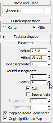 Unmittelbar nach der Erstellung eines Objekts können Sie Parameter wie beispielsweise Größe und Form anpassen, indem Sie die Werte in der Erstellungsgruppe im Rollout "Parameter" ändern.