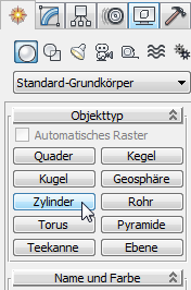 (Geometrie). Stellen Sie sicher, dass in der Dropdown-Liste "Standard-Grundkörper" ausgewählt ist, und klicken Sie anschließend im Rollout "Objekttyp" auf "Zylinder", um diesen zu aktivieren. Die Schaltfläche "Zylinder" wird hervorgehoben, wodurch angezeigt wird, dass sie aktiv ist und zum Erstellen verwendet werden kann.