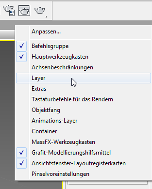 - Beim Start von 3ds Max ist der Werkzeugkasten "Layer" standardmäßig verdeckt. Wenn sie nicht angezeigt wird, klicken Sie mit der rechten Maustaste im Hauptwerkzeugkasten auf eine leere Stelle, und wählen Sie im Popup-Menü die Option "Layer".