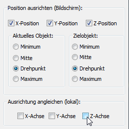 Bereich "Position ausrichten" die Optionen "X-Position", "Y-Position" und "Z-Position". Aktivieren Sie im Bereich "Ausrichtung angleichen" die Optionen "X-Achse", "Y-Achse" und "Z-Achse".