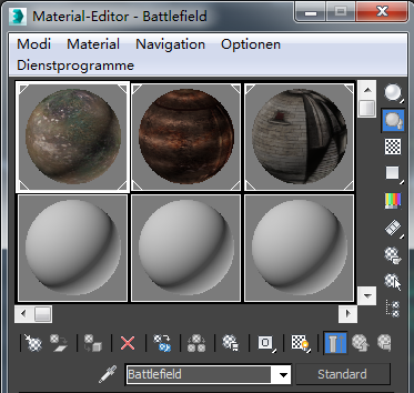 "Kompakter Material-Editor ". Standardmäßig zeigt der kompakte Material-Editor sechs Musterfelder an, von denen jedes ein Material aufnehmen kann. Üblicherweise stehen mehrere Materialien zur Auswahl. Daher können Sie die Anzahl der Musterfelder vergrößern, aus denen im Editor ausgewählt werden kann.