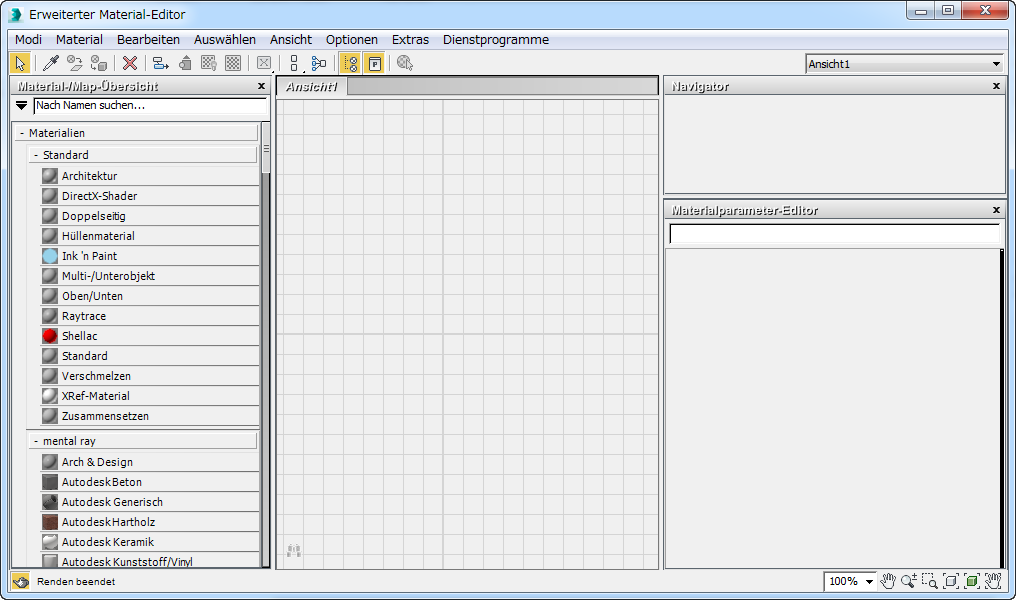 wurde zur Verwendung des mental ray-Renderers eingerichtet: Dies ist erforderlich, damit die mental ray-Materialien in der Material-/Map-Übersicht auf der linken Seite des erweiterten Material-Editors angezeigt werden.