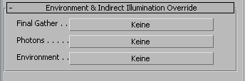 Legt den Shader für die Umgebung fest. Dies unterscheidet sich vom Eye ray-Shader: Er wird für sekundäre Rays verwendet, es sei denn, diese verfügen bereits über einen Shader.
