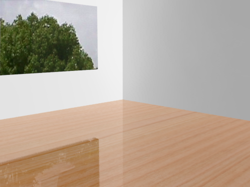Durch die Holzmaserung auf dem Boden entsteht ein Farbverlauf auf den Wänden, vor allem auf der rechten Seite der Szene.
