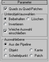 Anmerkung: Falls Sie diese Option deaktivieren, trianguliert 3ds Max Quads, wenn Sie den Modifikator In Patch umwandeln auf ein Netz- oder Polyobjekt anwenden.