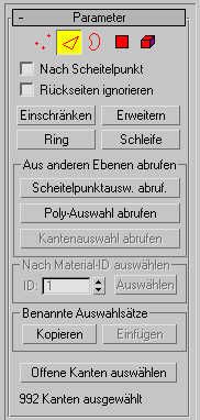 Wenn Sie hier auf eine Schaltfläche klicken, entspricht dies der Auswahl eines Unterobjekttyps im Modifikatorstapel. Klicken Sie erneut auf die Schaltfläche, um sie zu deaktivieren und zur Objektauswahlebene zurückzukehren.
