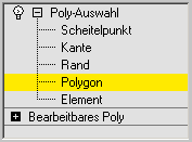 Mit dem Modifikator "Poly-Auswahl" können Sie eine Unterobjektauswahl im Stapel an nachfolgende Modifikatoren nach oben weitergeben. Er enthält einen Teil der Auswahlfunktionen des bearbeitbaren Polys. Sie können Scheitelpunkte, Kanten, Ränder, Polygone und Elemente auswählen. Sie können mit der Auswahl von der Unterobjektebene auf die Objektebene wechseln.