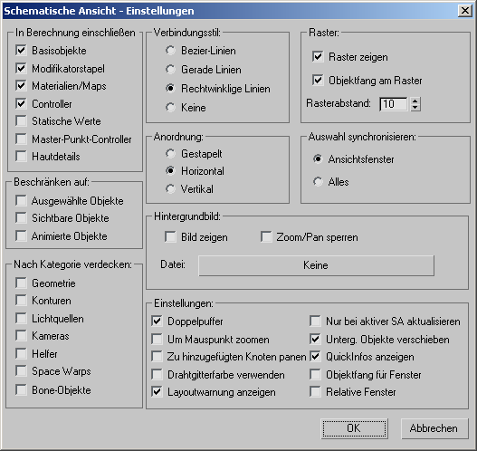 Wenn Sie in einer umfangreichen Szene die schematische Ansicht nur für die Auswahl verwenden, können Sie alle Elemente außer Basisobjekte deaktivieren. Wenn für Sie nur Materialien relevant sind, können sie Controller, Modifikatoren usw. deaktivieren.
