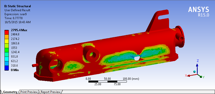 In der Nähe der Bohrung an der Seite des Tanks erkennen wir eine starke Materialerweichung. Wahrscheinlich wird in der Nähe der Bohrung ein Fehler auftreten, wenn der Tank weiter unter Druck gesetzt wird.