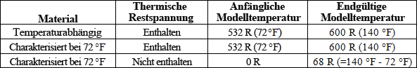 Die Werte der Modellausgangs- und -endtemperatur sind davon abhängig, ob die thermischen Restspannungen berücksichtigt werden. Wenn sie berücksichtigt werden, muss der Ausgangstemperaturwert identisch mit dem aktuellen Ausgangswert und die Endtemperatur identisch mit dem aktuellen Endwert sein. Dies ist darauf zurückzuführen, wie Helius PFA die Temperaturänderung ΔT von der spannungsfreien Temperatur bis zur Temperatur des Modells berechnet. Wenn die thermischen Restspannungen nicht berücksichtigt werden, sollte die Ausgangstemperatur des Modells 0 R betragen, und die Endtemperatur sollte die Temperaturänderung ΔT zwischen der Temperatur, bei der das Material charakterisiert wurde, und der Endtemperatur sein. Beispiel: Die unten stehende Tabelle listet Ausgangs- und Endtemperaturen für die drei Modelle in dem aktuellen Problem auf. Weitere Informationen zur Berechnung von ΔT finden Sie im Theoriehandbuch.